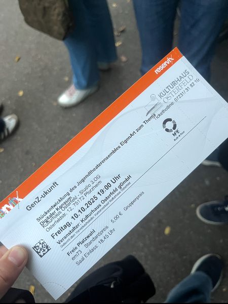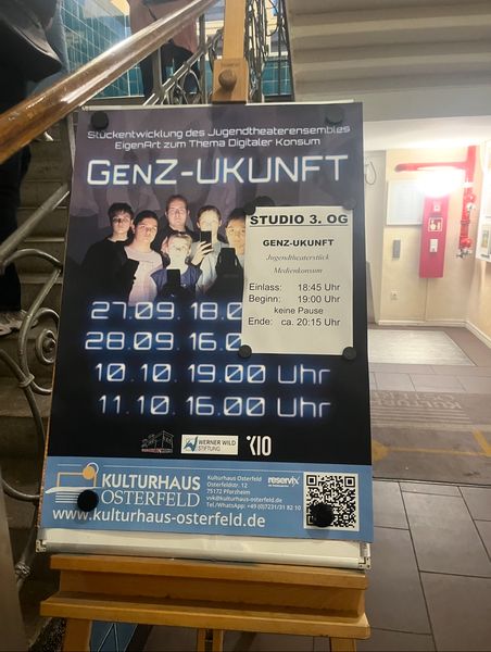 Am Freitag, den 10. Oktober, gingen wir mit unseren Klassenlehrerinnen Frau Oertel und Frau Birner ins Kulturhaus Osterfeld zu einem Theaterstück über Medienkonsum. Um 18:30 Uhr haben wir uns alle vor dem Eingang getroffen und unsere Tickets bekommen. Nach einer Viertelstunde ging es dann auch schon los. Das Publikum wurde kurz von zwei „Moderatoren“, welche auch Rollen im Theaterstück hatten, begrüßt.