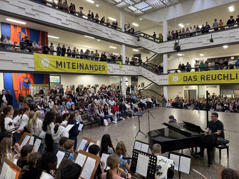 Bei der traditionellen Einschulungsfeier im Atrium hieß es wieder großer Bahnhof für unsere Neuen. Die Ränge waren voll, die Eltern der RGPler waren am Start, die Lehrer standen bereits - alles nur, um den Kleinsten unserer Gemeinschaft und ihren Eltern zu zeigen, dass wir uns freuen, dass unsere Reuchlinfamilie wächst.