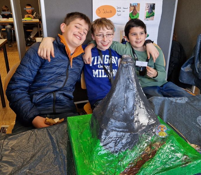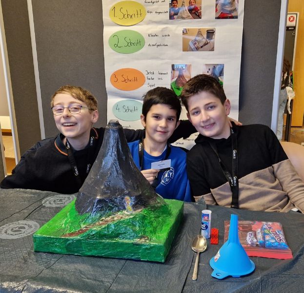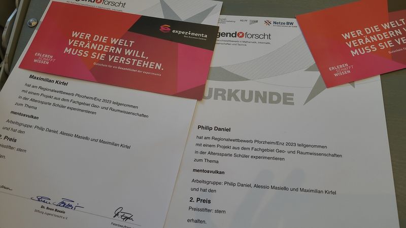 In der stimmungsvollen Ehrungsfeier im Audimax der Hochschule Pforzheim würdigte die Jury die kreativen Ideen der Reuchlin-Schüler mit entsprechend guten Platzierungen und Sonderpreisen. Im Bereich Technik belegte Yannis Dietrich den dritten Platz und konnte als Sonderpreis zusätzlich einen Kosmos Experimentierkasten gewinnen. Ebenfalls einen dritten Platz erzielten Yakup Dülgar, Laurin Klotz und Arina Rosemeier mit ihrem Projekt im Bereich Arbeitswelt. Auch konnten sie mit „plusMINT für interdisziplinäre Projekte“ einen Sonderpreis gewinnen. Noch besser schnitten Philip Daniel, Alessio Masiello und Maximilian Kirfel im Bereich Geo- und Raumwissenschaften ab: Mit ihrem „Mentosvulkan“ erreichten sie in dieser Wettbewerbskategorie den zweiten Platz und konnten sich zudem als Sonderpreis Tickets für die Experimenta in Heilbronn sichern.