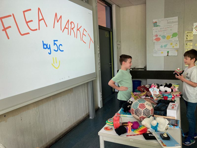 In den vergangenen Tagen und Wochen hatte sich die Klasse 5c im Englischunterricht bei Frau Lindenfelser mit dem Kaufen und Verkaufen von Dingen beschäftigt. Alle haben darauf hingefiebert, ihr erworbenes Wissen und Können endlich „in echt“ einzusetzen. Nach freundlichen Verkaufsgesprächen, aber auch harten Verhandlungen (It’s £6 – No, that’s too expensive! I can give you £3 – That isn’t enough. What about £5? - Can we do £4? - OK, £4.50 – OK), wechselten Teddybären, nicht mehr genutzte Spielsachen, Bücher, Schmuck und vieles mehr ihren Besitzer.