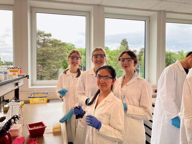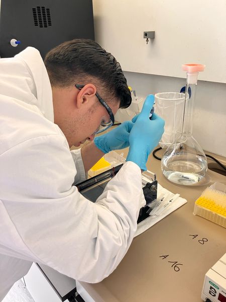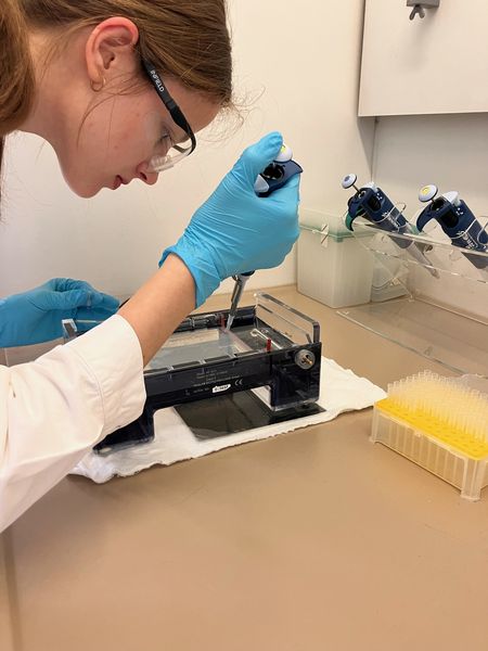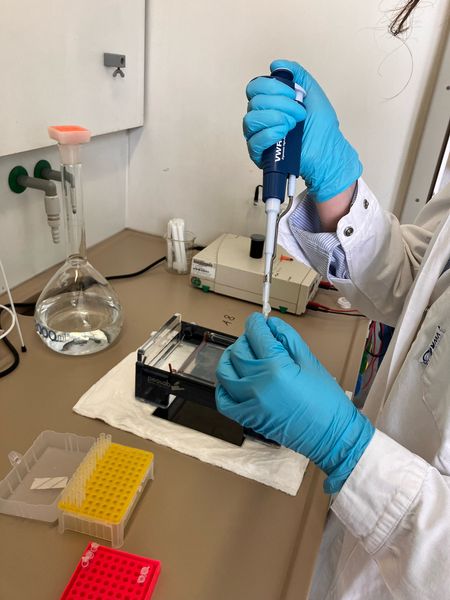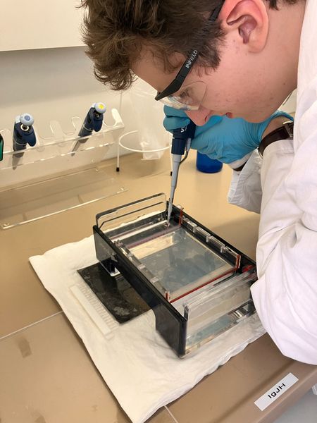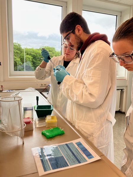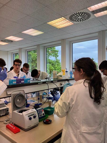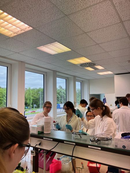 Ziel war es, unseren eigenen genetischen Fingerabdruck zu bestimmen. Nach der Sicherheitsbelehrung ging es schon los und wir übten im Labor erst einmal das Pipettieren. Daraufhin isolierten wir unsere DNA mithilfe eines Abstriches.