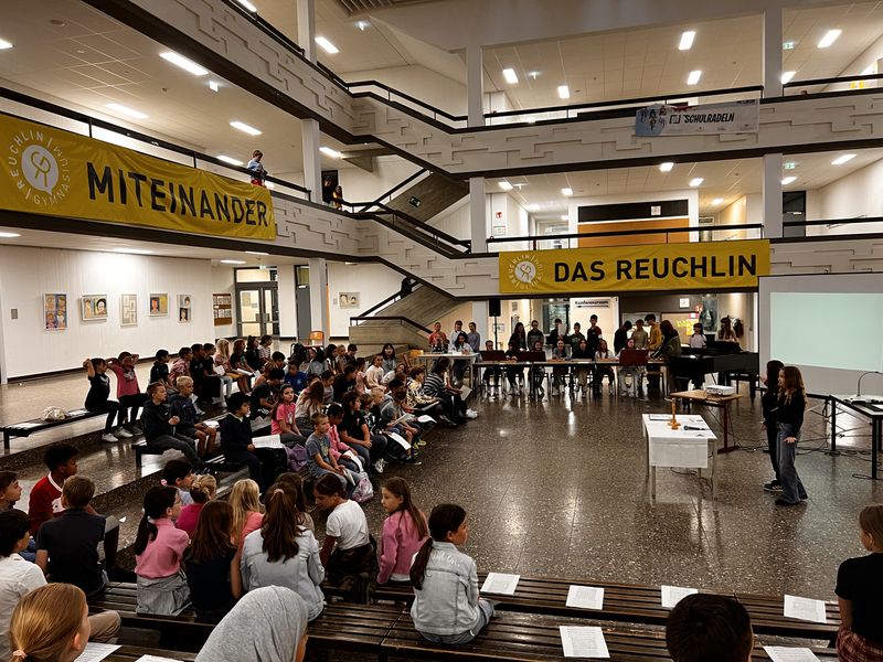 Aber es fehlte doch noch was, denn wir waren noch nicht ganz vollzählig, denn unsere jüngsten Familienmitglieder kamen wie immer erst am Dienstag zu uns. Und was für ein Empfang das war: tosender Beifall und herzliche Willkommensworte begleiteten die Fünfer in ihrer ersten Stunde bei uns am Reuchlin. Nach der Zuteilung in die Klassen stand dort dann das erste Kennenlernen an.