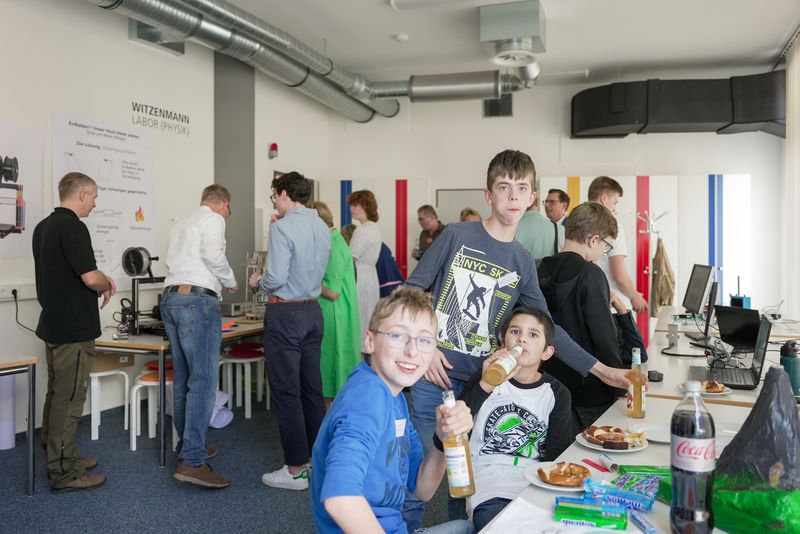Nach dem offiziellen Teil hatten die geladenen Festgäste die Möglichkeit, die Wettbewerbsprojekte unserer Jugend forscht AG zu begutachten. Yannis Dietrich präsentierte seinen laufenden Wecker, Arina Rosemeier und Yakup Dülgar ihre Messwerte für eine sinnvolle Belüftung von Klassenzimmern und Philip Daniel, Maximilian Kirfel und Alessio Masiello stellten ihren Mentos-Vulkan vor.