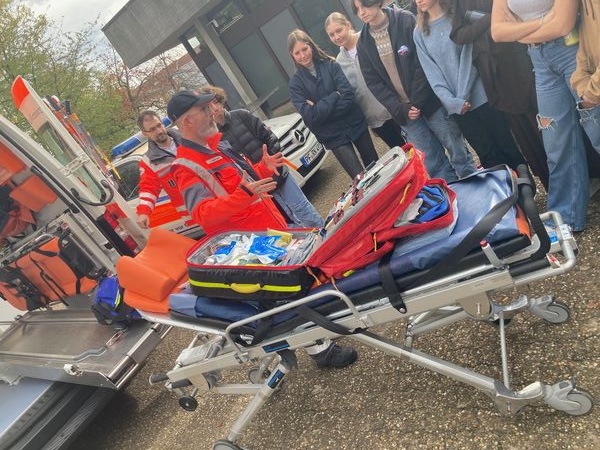 Beide Spezialisten präsentierten ihre Rettungsfahrzeuge und gewährten den Schülern einen aufschlussreichen Einblick in das Metier der Rettungsdienste. Im Verlauf der Veranstaltung wurden den Schülern die Inhalte der Einsatzfahrzeuge in detailreicher Darstellung vermittelt. Besonderes Augenmerk wurde hierbei auf das zu transportierende Equipment sowie die Unterscheidungsmerkmale zwischen den beiden Fahrzeugtypen gelegt. Die Schüler erhielten zudem Einblicke in die divergierenden Befugnisse eines Sanitätshelfers, eines Rettungssanitäters und eines Notfallsanitäters. Die praxisnahe Ausgestaltung gestattete es den Schülern, das erworbene theoretische Wissen unmittelbar anzuwenden und zu vertiefen. So wurde unter anderem die Frage erörtert, welcher Unterschied zwischen technischem und medizinischem Sauerstoff besteht. Insbesondere die fakultative Begehung der Einsatzfahrzeuge stellte einen Höhepunkt dar, bei dem die Schüler die Möglichkeit hatten, die Ausrüstung hautnah zu erleben und Fragen unmittelbar an die Fachkräfte zu richten. Die Erste-Hilfe-AG und der Schulsanitätsdienst sind für diese lehrreiche Erfahrung dankbar und möchten sich herzlich bei den engagierten Rettungsdienstmitarbeitern bedanken, die ihre Zeit und Expertise großzügig für diese Veranstaltung zur Verfügung gestellt haben.