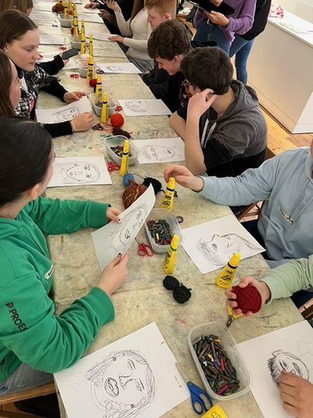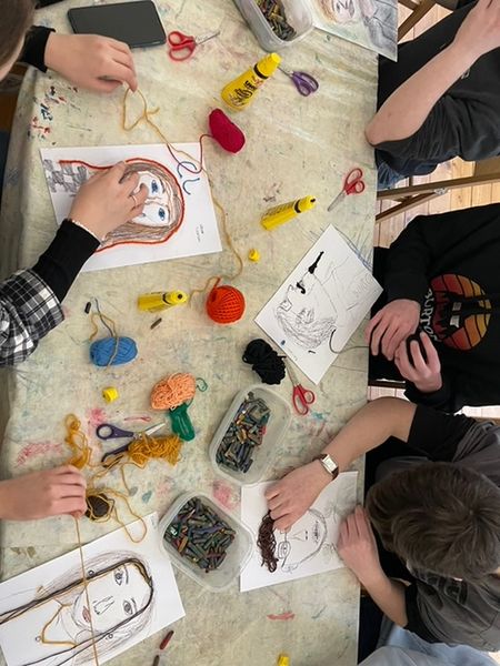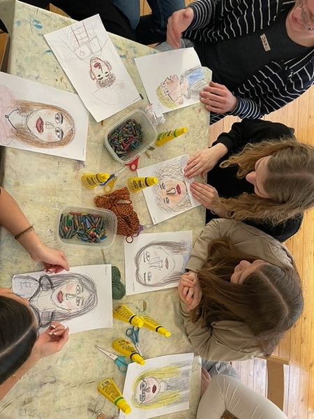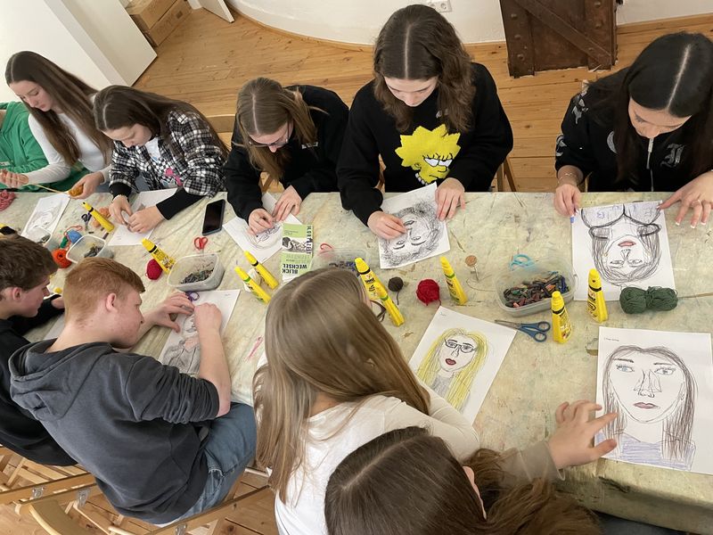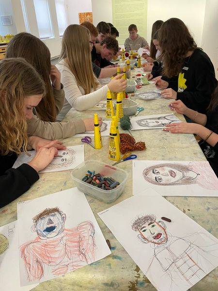 Nachdem wir alle Bilder angesehen hatten, durften wir auch selbst künstlerisch tätig werden. Wir fertigten Speedportraits unserer Mitschüler an, indem wir selbst jeweils 20 Sekunden an einem Portrait arbeiteten und es dann an die nächste Person weitergaben. Dabei entstanden ein paar sehr witzige Bilder, die wir am Schluss mit Wachsmalstiften und anderen Kunstmaterialien verschönern konnten.