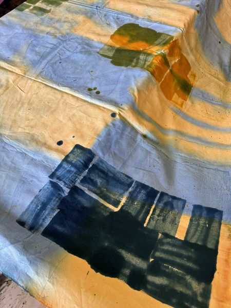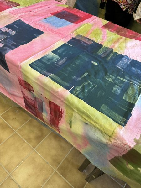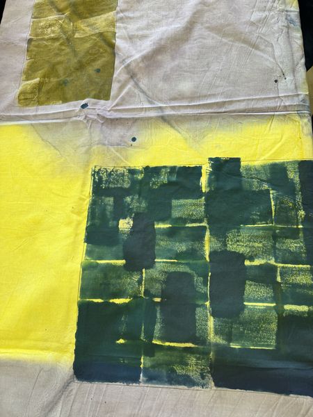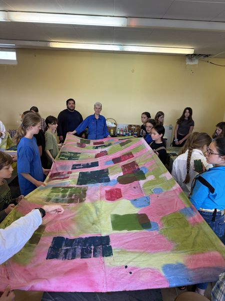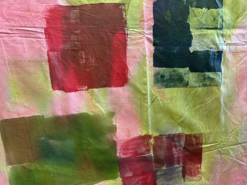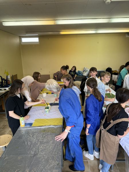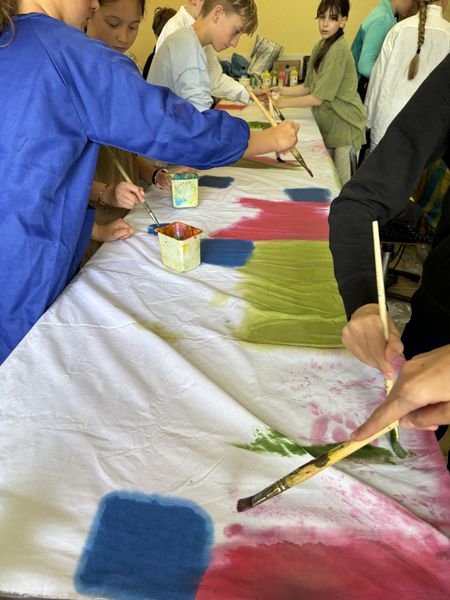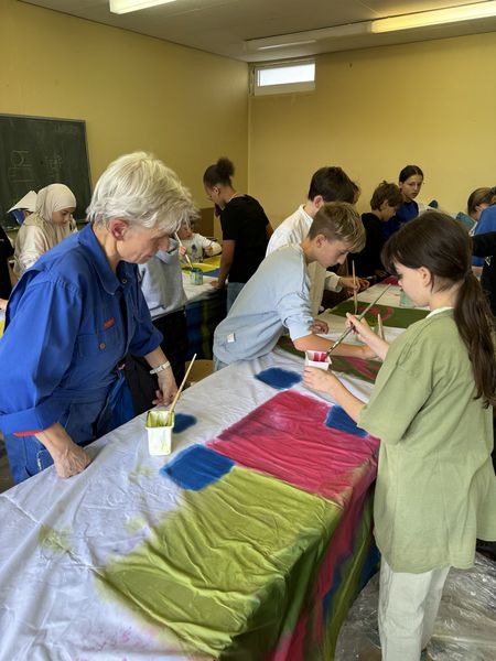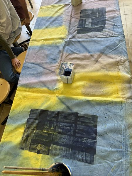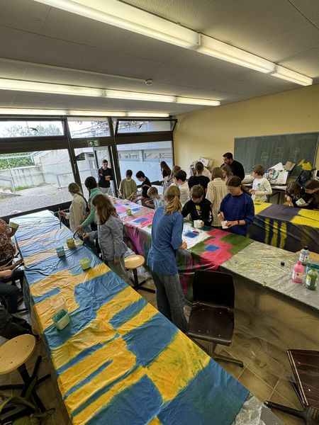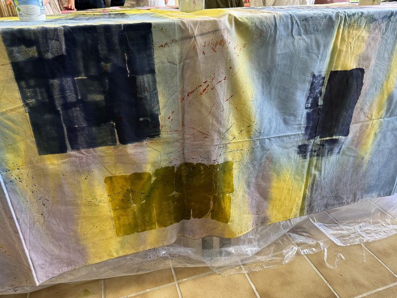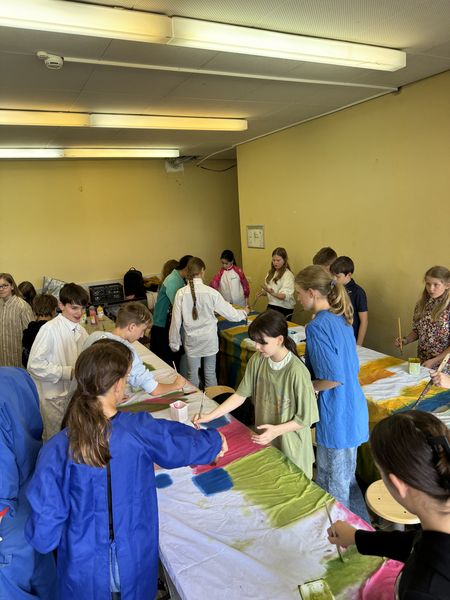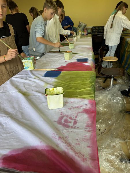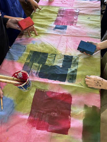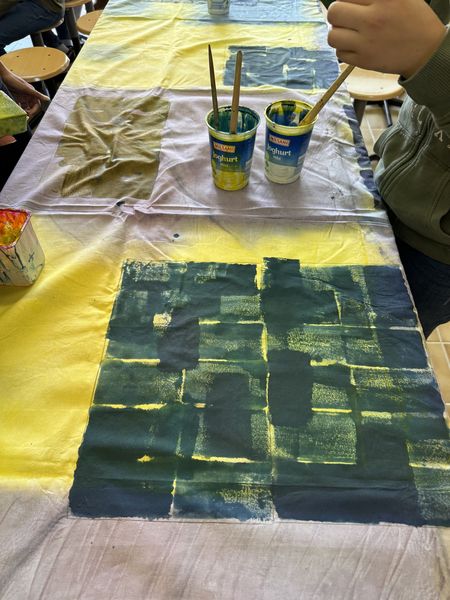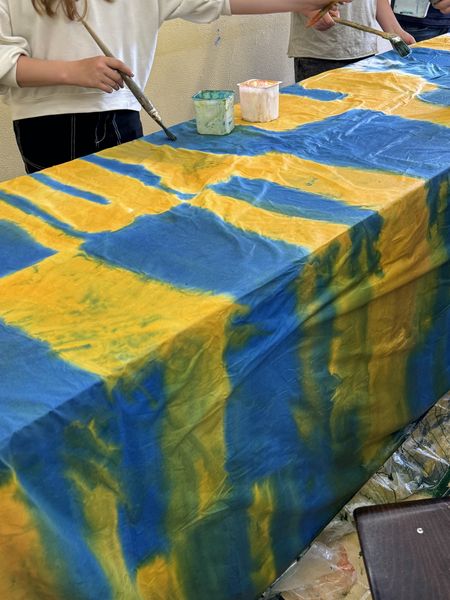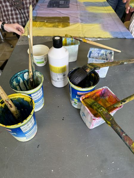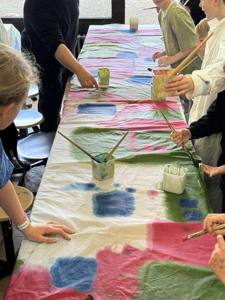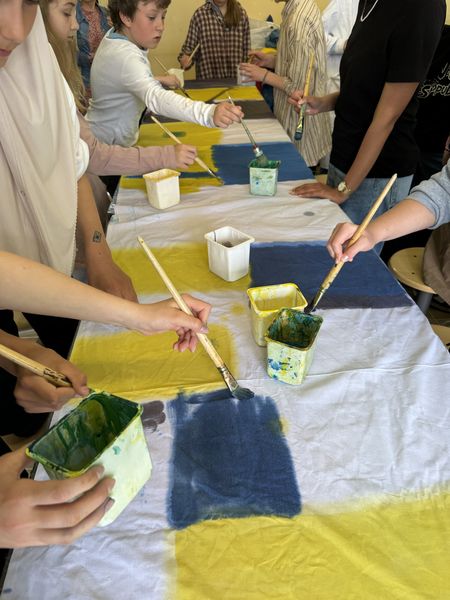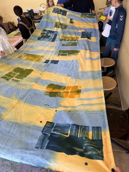 Zuerst wurde auf jeder Stoffbahn Textilfarbe lasierend aufgetragen, bevor im zweiten Schritt mit Stempeltechnik Muster aufgetragen wurden. So erhielt jede Fahne ihre individuelle Gestaltung, doch am Ende bildeten sie trotz unterschiedlicher Farbgebung eine Einheit.