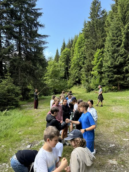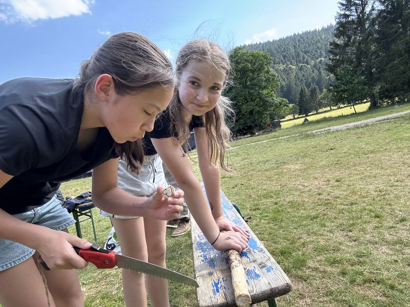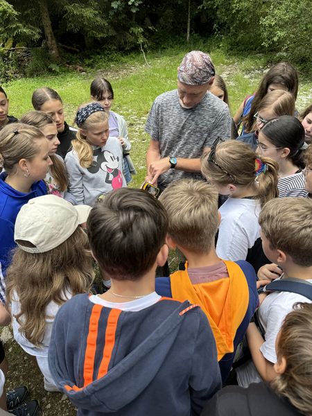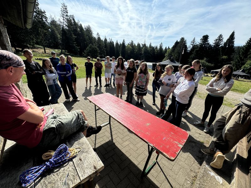 Heute sind wir um halb sieben aufgewacht und hatten erst einmal Langeweile, da wir noch nicht aus dem Zimmer durften. Wir haben uns über das Zauberspiel unterhalten und bemerkt, dass ein Mädchen aus unserem Zimmer ‚verzaubert‘ wurde. So haben wir uns an die Ermittlungsarbeiten gemacht. Schnell fanden wir heraus, dass es einer der beiden Betreuer war. Kurz darauf gab es Frühstück mit Brot, Obstsalat, Müsli, veganem Bacon und vielem mehr. Nach dem Frühstück hatten wir die Gelegenheit, die Person, die wir der Zauberei verdächtigen, anzuklagen. Wir freuten uns, dass wir mit unserem Verdacht richtig lagen. Nach ein wenig Freizeit gingen wir auf eine Wanderung, um die Gegend zu erkunden. Dabei haben wir insgesamt drei Gemeinschaftsspiele gespielt. Als wir zurückkamen haben wir zu Mittag gegessen und im Anschluss daran ein Geländespiel namens Asterix und Obelix gespielt, bei dem wir sogar einen Hirschschädel gefunden haben. Am Abend gab es noch ein Lagerfeuer und Musik, begleitet von Frau Rupp auf der Gitarre. Bei dieser Abendgestaltung haben wir auch anti-Verstecken gespielt und alle hatten viel Spaß. In der Nacht haben fünf Leute mit Marvin draußen übernachtet.
