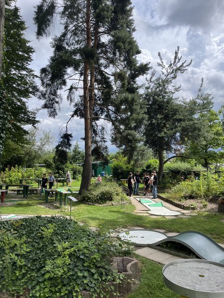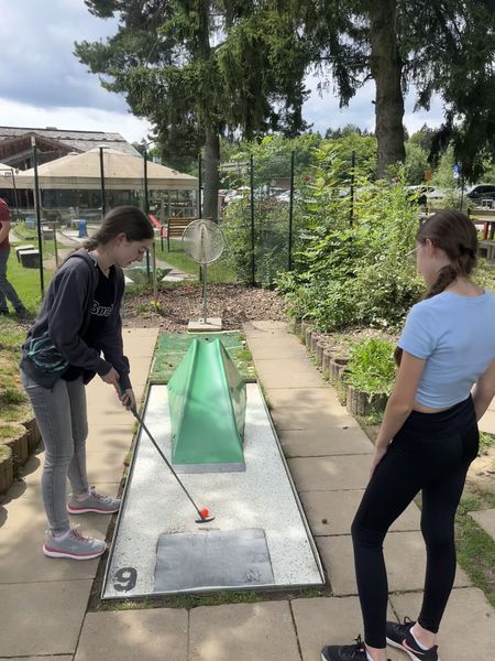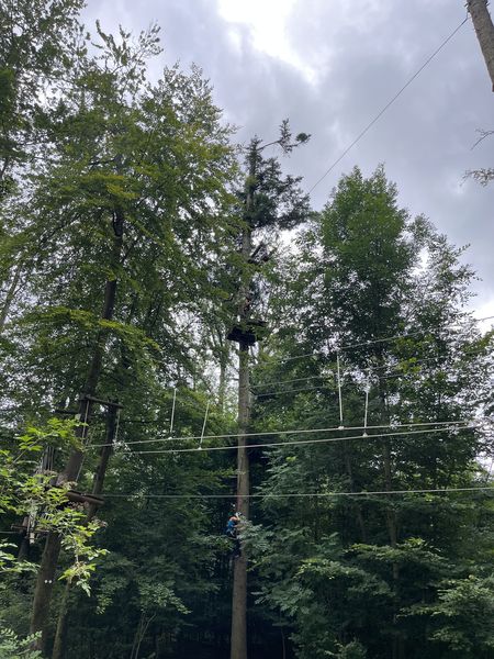 Am Morgen trafen sich alle Schülerinnen und Schüler gemeinsam mit den begleitenden Lehrkräften im Atrium. Die beiden Busse, die für die Fahrt reserviert wurden, standen pünktlich um 8:00 Uhr vor der Schule zur Abfahrt bereit, und dann ging es auch schon los. Nach einer halbstündigen, staufreien Fahrt kamen wir bereits in Rutesheim an. Bevor es in die ersten Kletterparcours ging, hieß es erstmal: Wertsachen verstauen, Ausrüstung anziehen und den Anweisungen der Klettertrainer folgen. Nach einem Übungsparcours konnte man dann selbst entscheiden, welcher der über 15 Parcours als nächstes geklettert wird. Dabei ging es in bis zu 12 Meter Höhe hoch hinaus. Für diejenigen mit Höhenangst und Fußverletzungen (oder wenn man eine Pause vom Klettern brauchte) stand eine Minigolf-Anlage zur Verfügung. Bei den Schülerinnen und Schülern ist auch die Trampolin-Netzanlage gut angekommen, in der sogar zur Freude der Schüler Ballspiele erlaubt waren. Nach einem kurzweiligen Vormittag machten wir uns dann ausgepowert, aber glücklich und unverletzt um 14 Uhr auf den Rückweg. Das Wetter war uns wohlgesonnen und der Regen setzte erst ein, als wir bereits im Bus saßen.