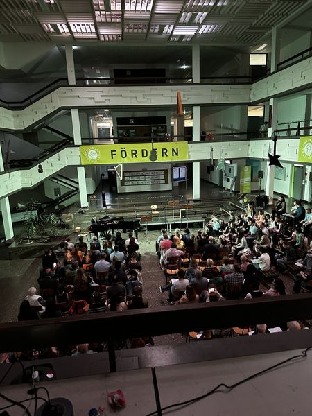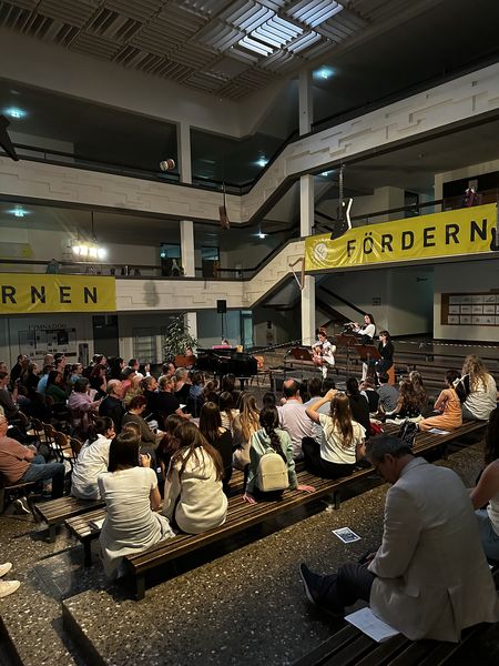 Hierbei handelt es sich um ein Konzert, bei dem die Schülerinnen und Schüler des Reuchlin-Gymnasiums die Möglichkeit erhalten, solistisch oder in einem kleinen Ensemble vor einem größeren Publikum aufzutreten. Aufgrund zahlreicher Anmeldungen aus nahezu allen Klassenstufen konnte das Konzert im großen Atrium der Schule stattfinden, welches von der Technik-AG in stimmungsvolles Licht getaucht wurde.