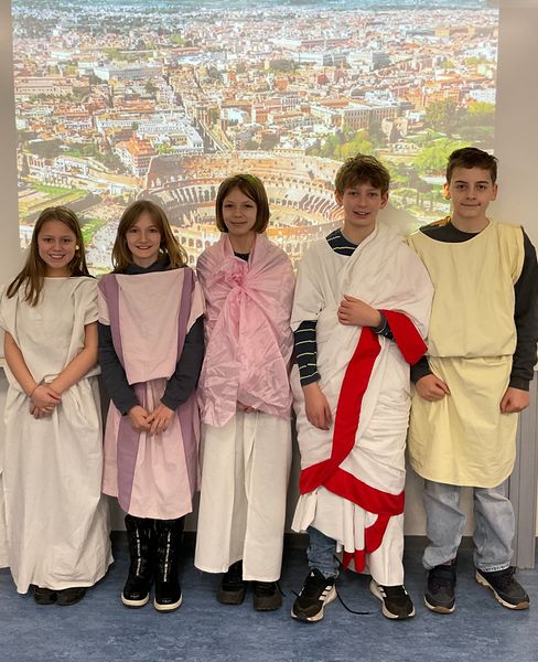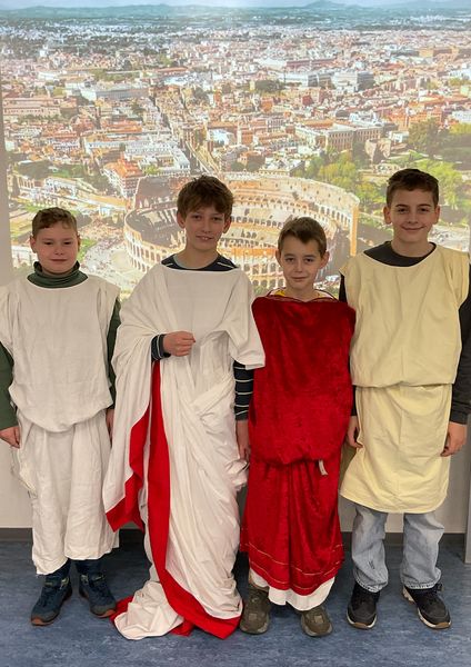 In der letzten Stunde vor den Weihnachtsferien durften die Lateinschülerinnen und -schüler der Klasse 5 a „hautnah“ die Kleidung der Römer erleben. Diese war, wie sie feststellen mussten, zunächst nicht sehr einfallsreich: Eine Tunika als klassisches Kleidungsstück bekam jede(r) ab.