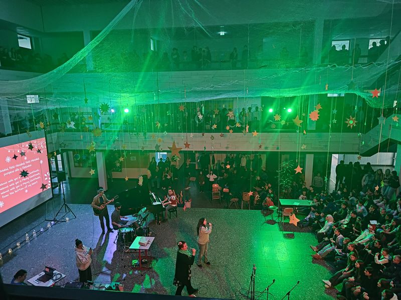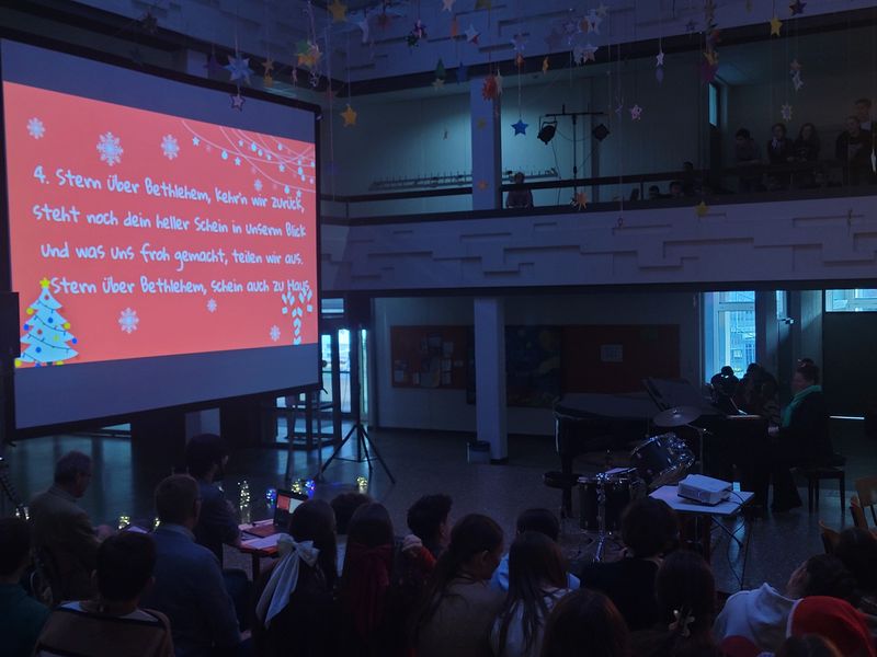 Von der Technik AG in schummriges Licht getaucht waren alle eingeladen den musikalischen und inhaltlichen Beiträgen zu lauschen und wie immer auch mitzusingen.