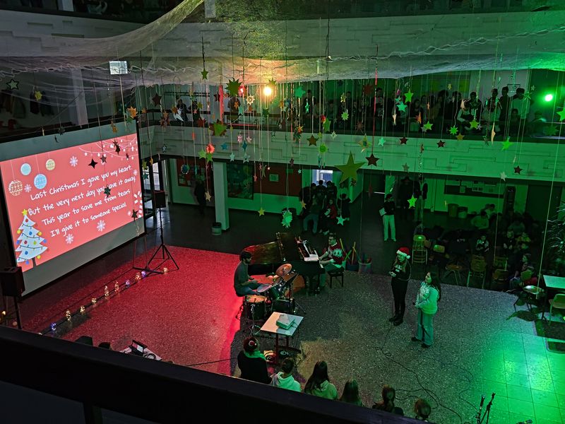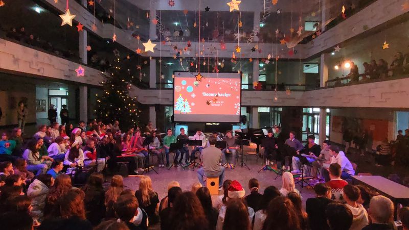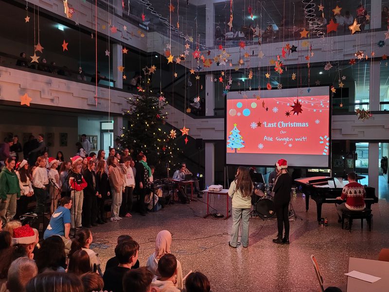 Das ganze Reuchlin wurde zum Singen gebracht mit dem weihnachtlichen Dauerbrenner „Last Christmas“, das in den Strophen solistisch dargeboten wurde, und auch „Feliz Navidad“ ganz am Ende durfte nicht fehlen.