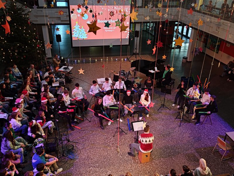 Die Musikkurse aus der Kursstufe 1 von Herrn Binder und Herrn Weigand erstaunten mal wieder, was mit Boomwhackern so alles möglich und machbar war.