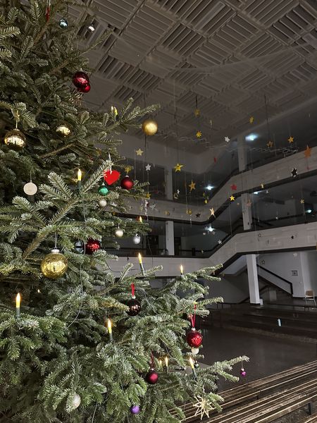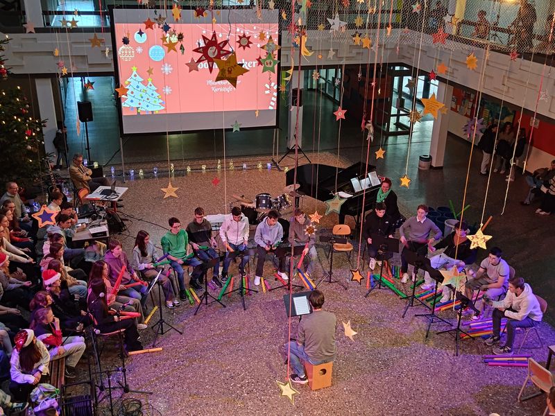 Beim Jahresabschluss am Reuchlin-Gymnasium strahlte wie gewohnt der geschmückte Weihnachtsbaum der SMV und die Sterne mit den Wünschen aller Schülerinnen und Schüler aus allen Klassen zierten das Atrium.