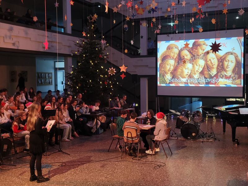 Der christliche Teil wurde durch eine Gesamtengelkonferenz (GEK) eingeleitet, die erst mal konferierten, wie die Geschehnisse um die Weihnachtsgeschichte eingeordnet werden konnten, bevor es zur Weihnachtsansprache von Herrn Schleifer überging. Die Religionsklassen aus Klasse 7 (Frau Bohnen/ Herr Schleifer) schlossen mit den Fürbitten die Anliegen unserer Zeit ein und führten uns zum gemeinsamen Vater Unser. Sehr festlich wurde das gemeinsame „O du fröhliche“ von zwei 6. Klassen von Herrn Weigand auf den Blockflöten begleitet und das ganze Atrium war am Singen.
