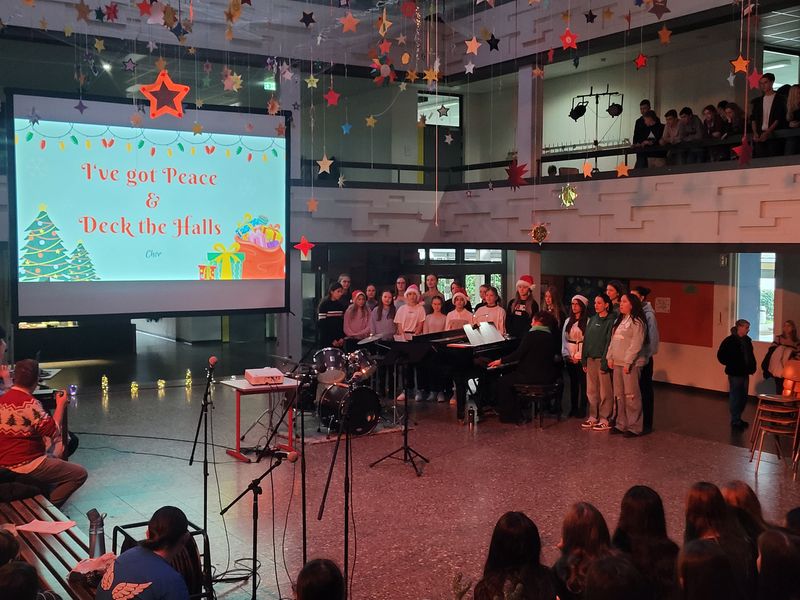 Mit einem Gospel zum Frieden gemischt mit den Klängen zu „Deck the halls“ zogen weihnachtliche Klänge in das Atrium ein durch den Chor und Frau Scherer, die immer wieder den Gesang der Schulgemeinschaft unterstützten.