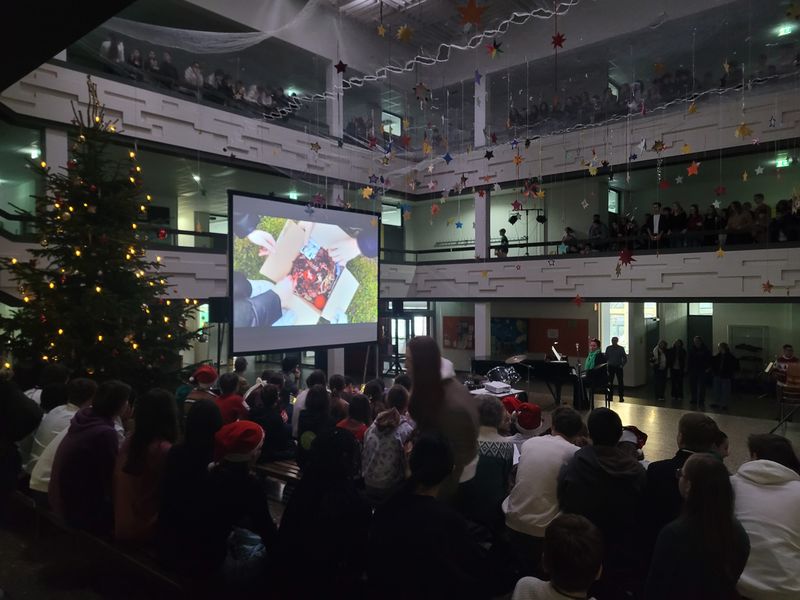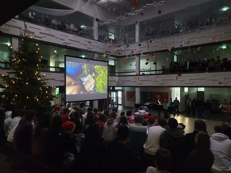 Die Feier wurde von den Filmen des Seminarkurses (Frau Plachta/ Herr Binder) umrahmt. Die Schulgemeinschaft wurde auf die Botschaft von Weihnachten eingestimmt und im zweiten Beitrag wurden die Herausforderungen des „Wichtelns“ thematisiert.