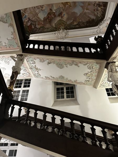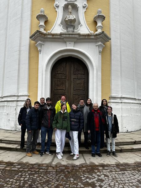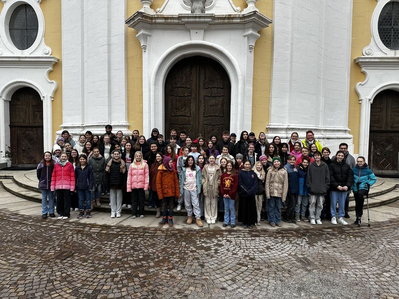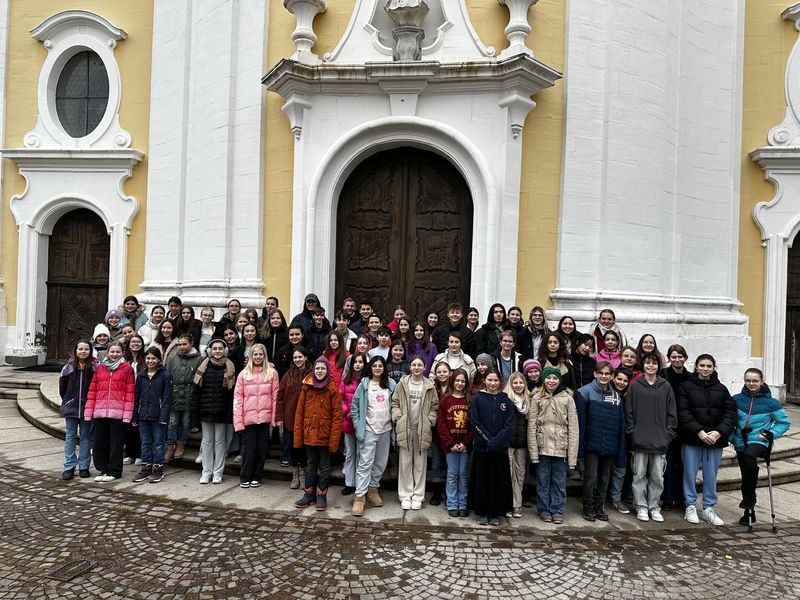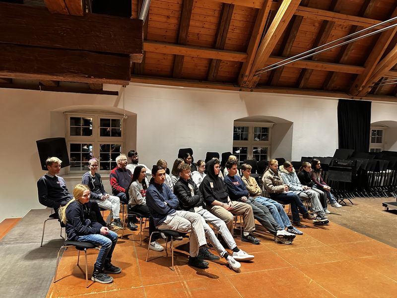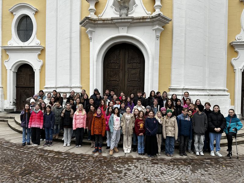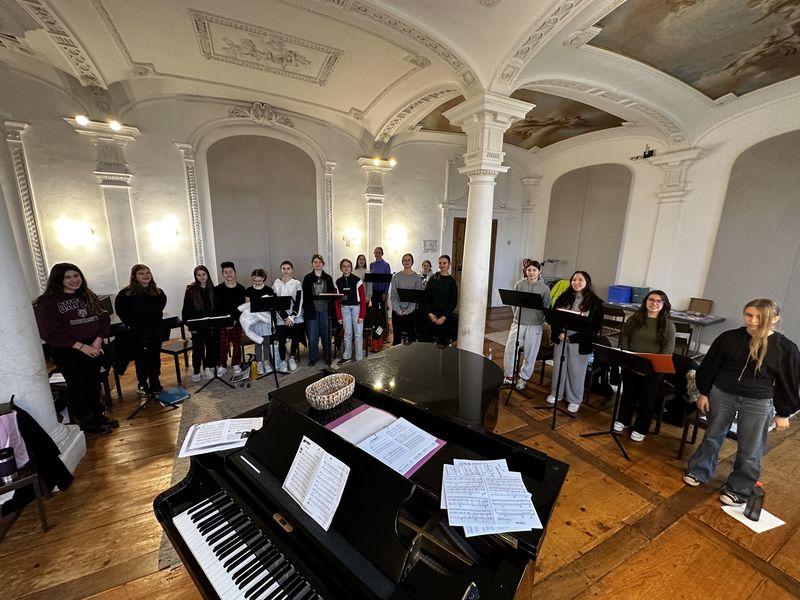 Am Abfahrtstag erwies sich die Anreise zur Schule durch Eisesglätte als deutlich schwieriger für die über 70 Musikerinnen und Musiker als die Fahrt im Doppeldeckerbus zum ehemaligen Benediktinerkloster im Anschluss. Nachdem alle wohlbehalten im weniger glatten Örtchen an der Oberschwäbischen Barockstraße angekommen waren, wurden zuerst die Betten und dann die Proberäume erfolgreich bezogen und die Proben in den einzelnen Ensembles begannen.