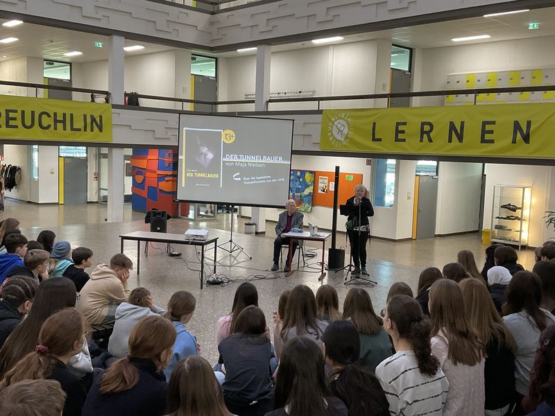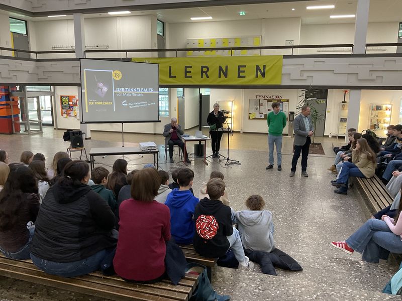 Gegen 9.50 Uhr wussten alle 8. Klassen sowie die Klasse 7a, die auf den Holzbänken Platz genommen hatten, mehr: Es handelte sich um die Schriftstellerin Maja Nielsen, die aus ihrem Jugendroman „Der Tunnelbauer“ vorlesen würde, und Joachim Neumann, dessen Lebensgeschichte (bzw. einen bedeutsamen Teil davon) sie in diesem erzählt.