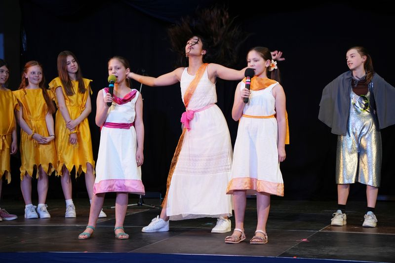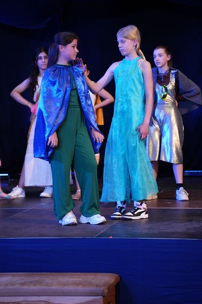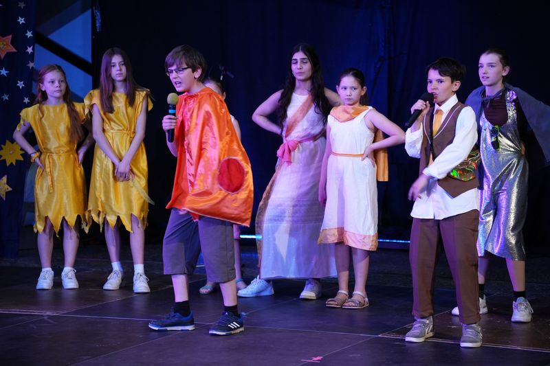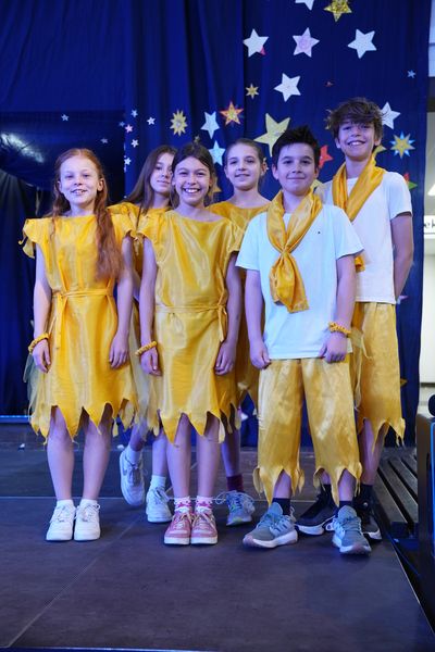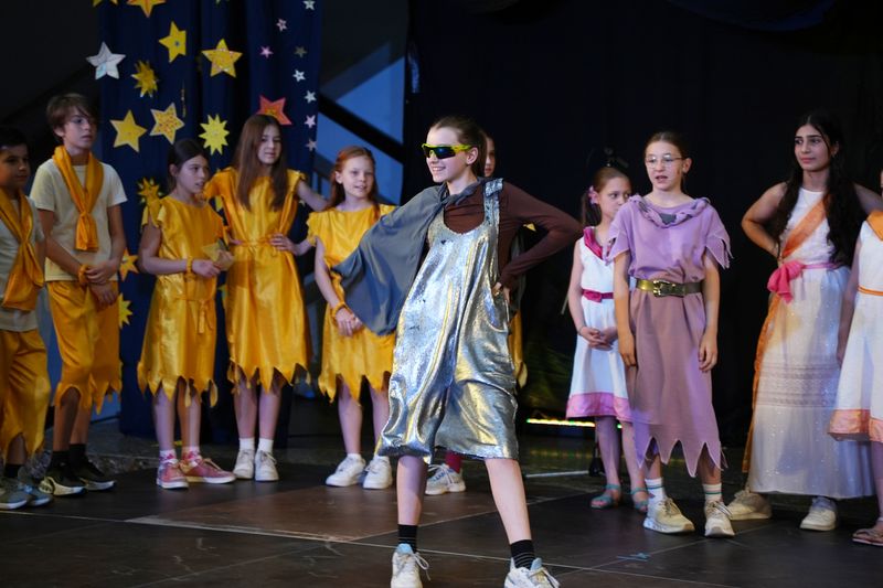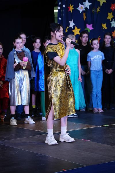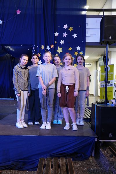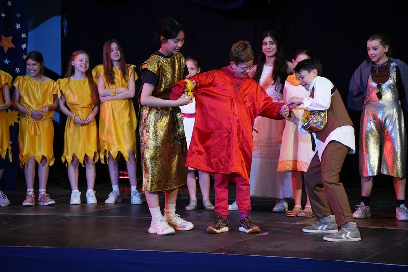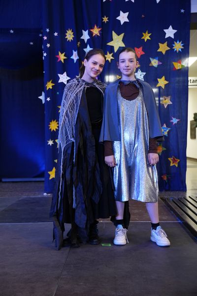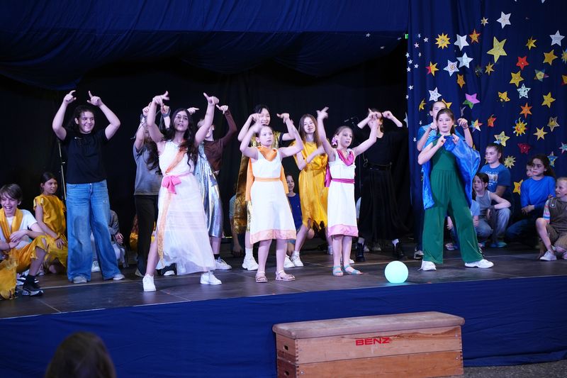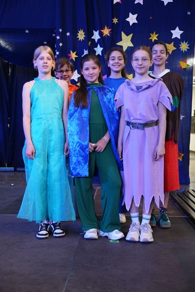 Ab März begann die heiße Phase der Produktion: Die Kostüme, für deren Gestaltung Silke Burton mit viel Kreativität und Liebe zum Detail verantwortlich war, wurden fertiggestellt. Gleichzeitig entstand ein aufwendiges Bühnenbild mit selbst gebastelten Sternen. Es wurde gesungen, getanzt, Texte gelernt, Szenen geprobt, ein Rap geschrieben und ein von Viana Ecer (6a) eigens entwickelter Tanz einstudiert. Parallel dazu probten die Gesangssolistinnen und -solisten. In der Woche vor den Aufführungen wurde täglich bis in den Abend hinein geprobt, der letzte Feinschliff gesetzt und mit viel Energie an Details gefeilt. In dieser Phase kam auch das Technikteam unter der Leitung von Herrn Binder dazu, das mit großem Einsatz, viel Herzblut und technischer Präzision für den Ton und das passende Licht sorgte.