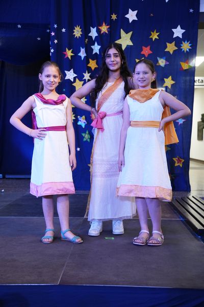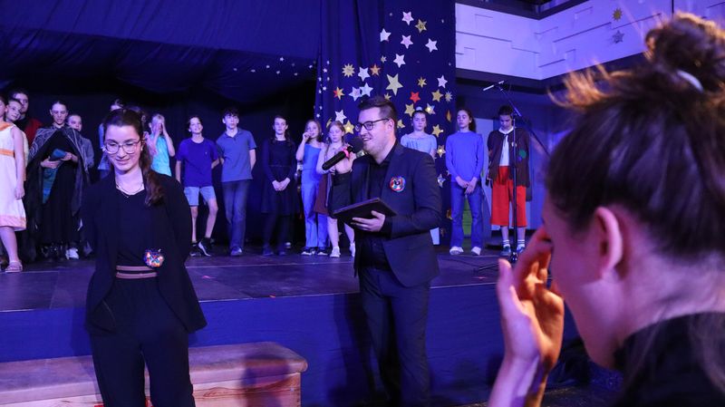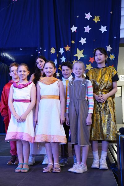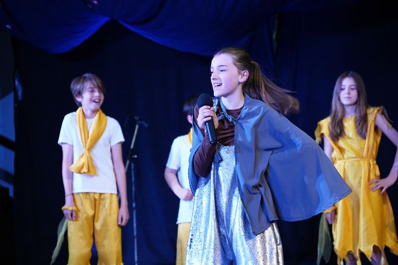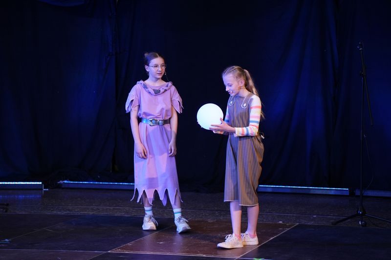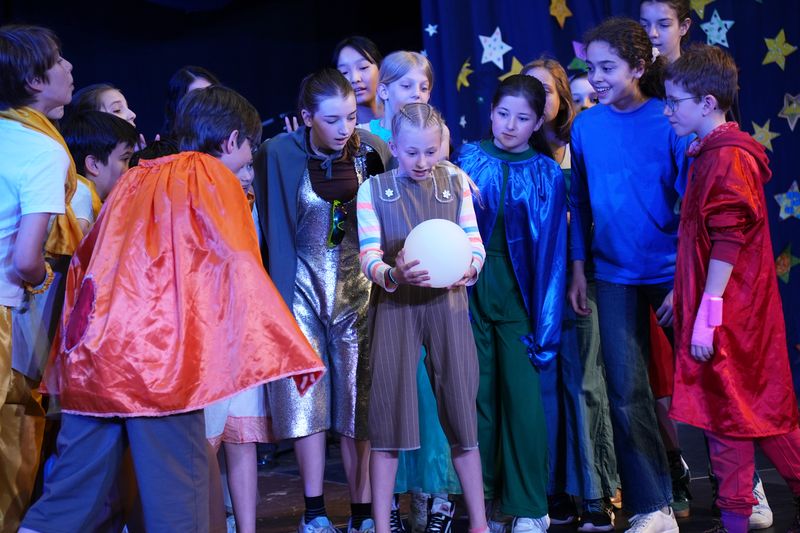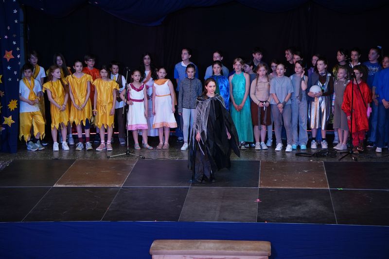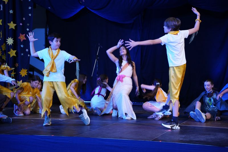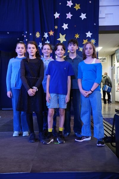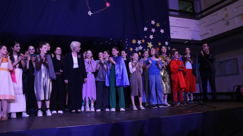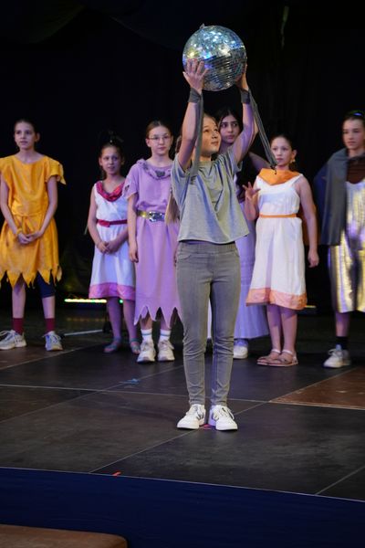 Ab März begann die heiße Phase der Produktion: Die Kostüme, für deren Gestaltung Silke Burton mit viel Kreativität und Liebe zum Detail verantwortlich war, wurden fertiggestellt. Gleichzeitig entstand ein aufwendiges Bühnenbild mit selbst gebastelten Sternen. Es wurde gesungen, getanzt, Texte gelernt, Szenen geprobt, ein Rap geschrieben und ein von Viana Ecer (6a) eigens entwickelter Tanz einstudiert. Parallel dazu probten die Gesangssolistinnen und -solisten. In der Woche vor den Aufführungen wurde täglich bis in den Abend hinein geprobt, der letzte Feinschliff gesetzt und mit viel Energie an Details gefeilt. In dieser Phase kam auch das Technikteam unter der Leitung von Herrn Binder dazu, das mit großem Einsatz, viel Herzblut und technischer Präzision für den Ton und das passende Licht sorgte.