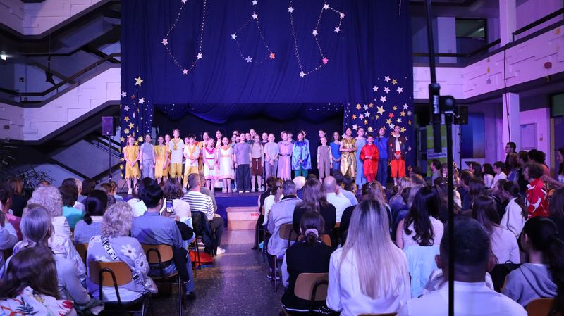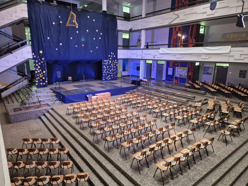 Am 22. und 23. Mai 2025 verwandelte sich das Atrium des Reuchlin-Gymnasiums in ein musikalisches Universum: Der Unterstufenchor brachte an zwei aufeinanderfolgenden Abenden das Musical Leben im All von Gerhard A. Meyer auf die Bühne – und wurde vom Publikum mit Standing Ovations gefeiert. Das Stück erzählt die fantasievolle und mitreißende Geschichte verschiedenster Himmelskörper auf ihrer Reise durch das Weltall. Was zunächst wie eine wilde Sternenfahrt erscheint, wird bald zu einer berührenden Geschichte über Freundschaft, Anderssein und das gemeinsame Leuchten am Himmel.