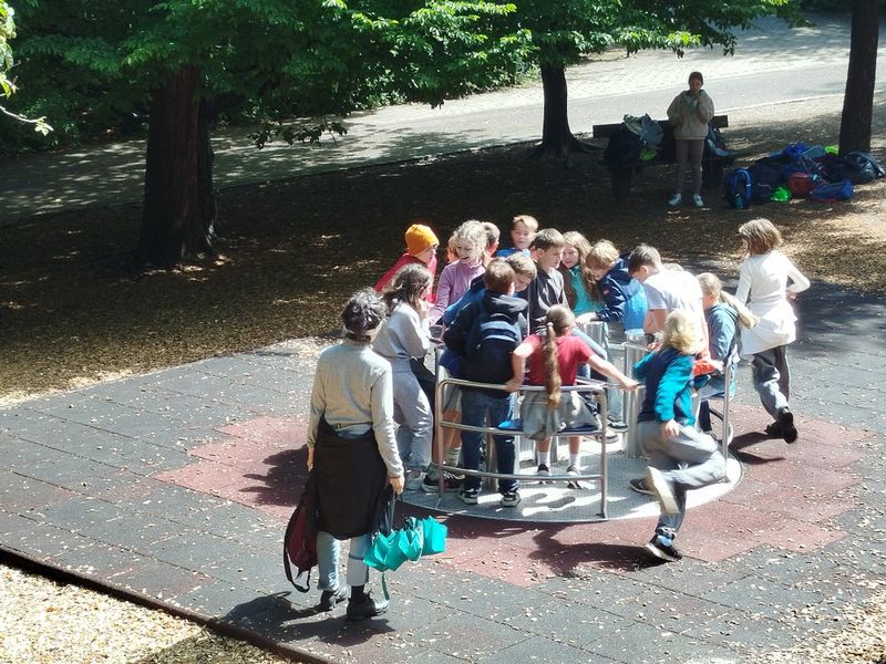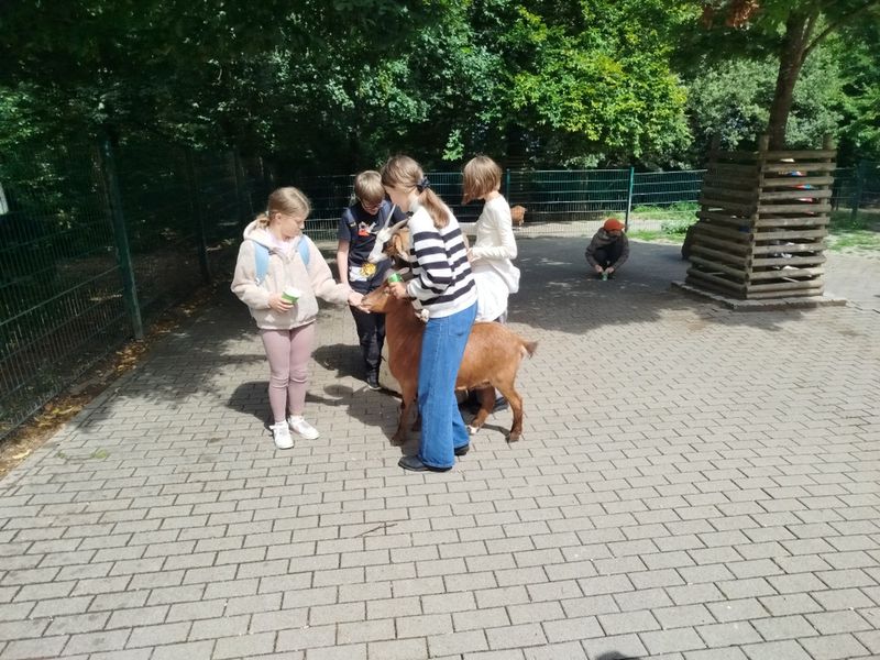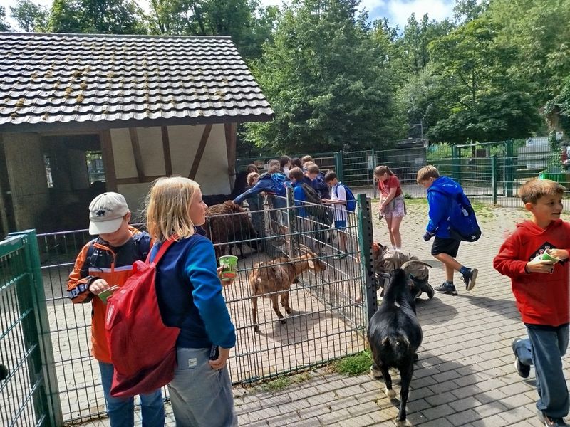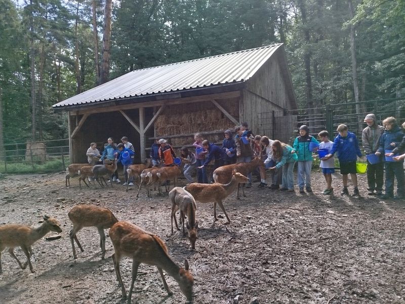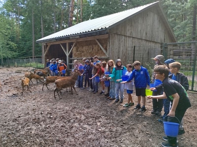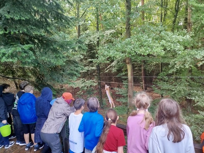 Im Wildpark nahm die Klasse mit Freude an einer Führung teil. Sie lernten, wie die Tiere gefüttert werden. Noch besser: Sie durften die Tiere selbst füttern, was alle begeisterte. Besonders spektakulär war die Schaufütterung beim Luchs. Der Luchs kann wirklich hoch springen! Das live erleben zu können war wirklich toll. Zum Schluss stand noch ein Besuch im Streichelzoo auf dem Programm, der allen großen Spaß machte. Danach gab es etwas Pause auf dem Spielplatz. Moment, Pause? … Pause war das nicht wirklich. Die 5a spielte noch voller Freude und Energie auf dem Karussell. Danach war aber wirklich Ende (oh, schon vorbei?) und wir mussten nach Hause. Einige Kinder wurden dort abgeholt, eine kleinere Gruppe lief zurück zur Schule. Dieses Mal war das Wetter deutlich freundlicher.