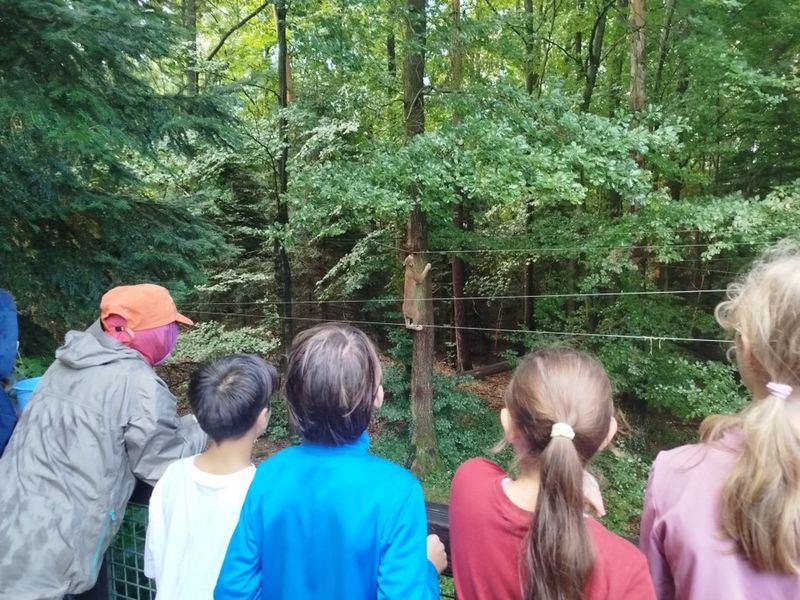 Die nette Gruppe scheute sich nicht vor dem Wetter, das den Weg etwas komplizierter machte als allen lieb war. Aber Regenschirm, Regenmantel und gute Laune waren dabei, also war alles Notwendige vorhanden. Nach einer Weile durch die Stadt und hoch über den Wald ist die Klasse schließlich am Wildpark angekommen. Etwas nass, aber bereit für ein tolles Erlebnis.