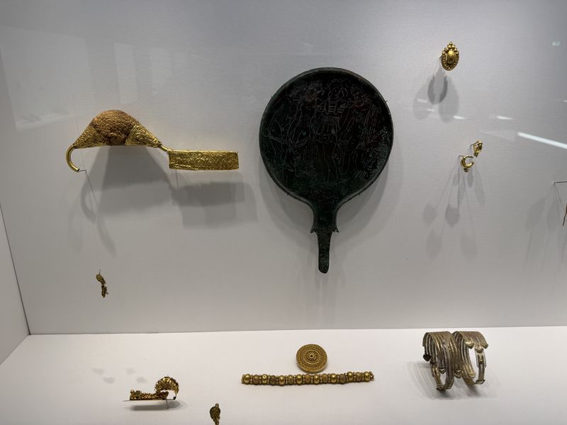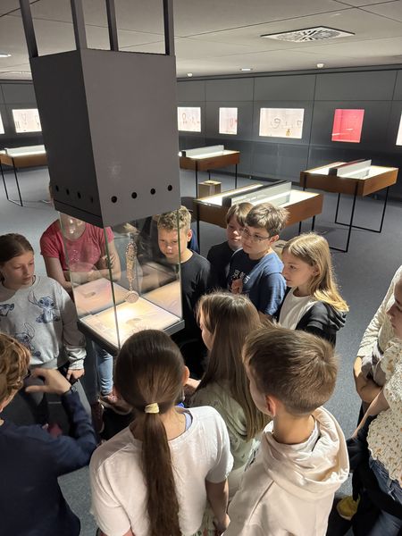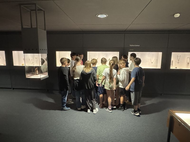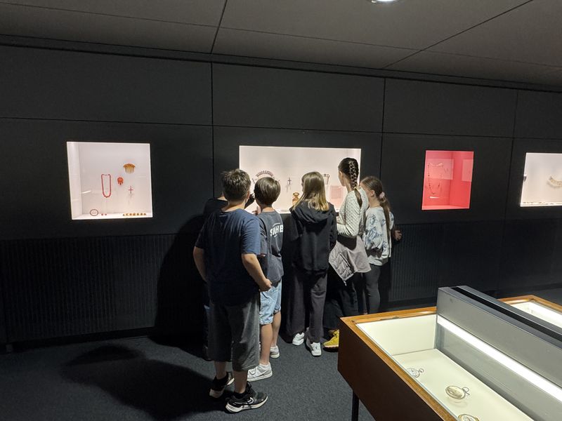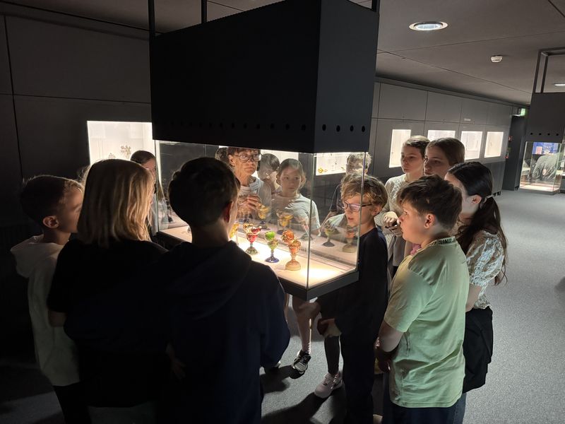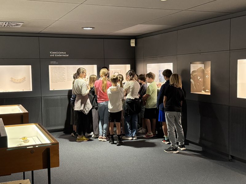 Der Tag im Museum startete mit einem Gang durch die Ausstellung, in der die Schüler viele Schmuckstücke aus unterschiedlichen Jahrhunderten finden konnten. Die Klasse musste sich ein Kleingruppen zusammentun und jede Gruppe bekam eine kleine Schatulle mit einem Schmuckgegenstand. Aufgabe war es nun, in den Vitrinen der Ausstellung Schmuckstücke zu finden, zu denen der Gegenstand passt. Alle Gruppen waren sehr kreativ und erfolgreich und nacheinander stellte jede Gruppe vor, für welches Schmuckstück sie sich entschieden hatte und wieso.