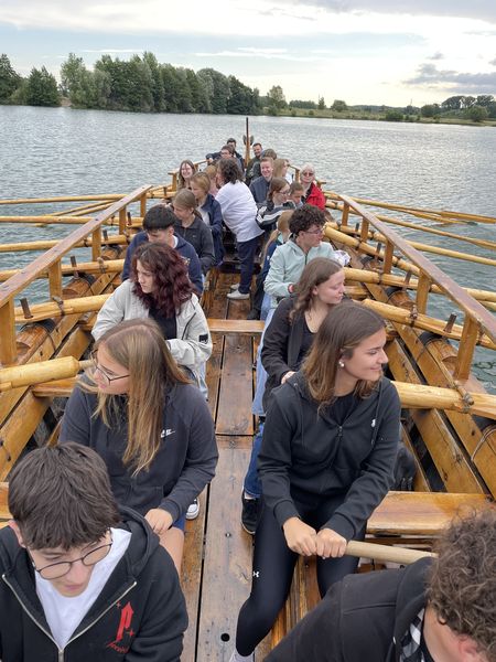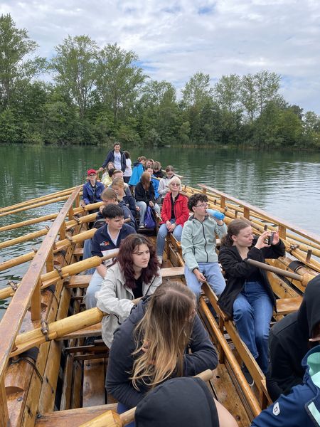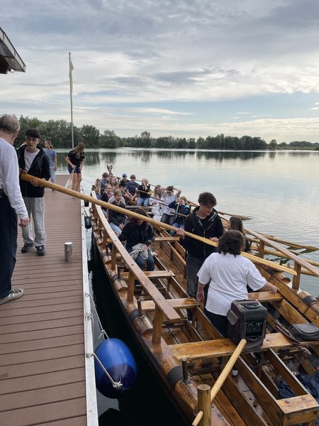 Die Lateinschüler erlebten das Aufrüsten des Schiffes mit Rudern, erlernten das Ablegemanöver und wurden vom Kommandanten die wichtigsten Befehle gelehrt, um das Schiff sicher auf dem See bewegen zu können. Das schweißtreibende Rudern wurde aus Sicht der neuen Crew glücklicherweise mit Pausen unterbrochen, in denen der Kapitän der „Lusoria Rhenana“ an originalen Fundstücken die vorgeschichtliche und römische Zeit Revue passieren ließ, um die Epochen noch plastischer vor das innere Auge treten zu lassen.