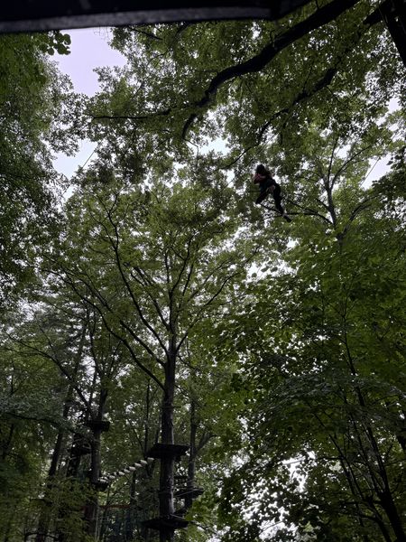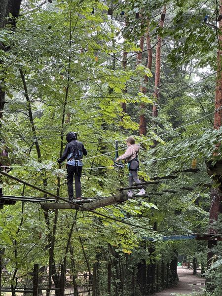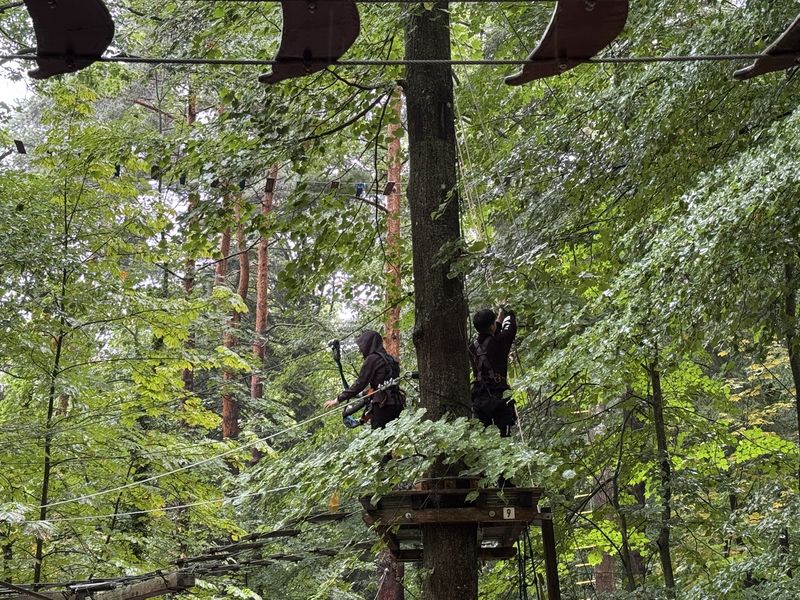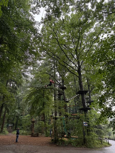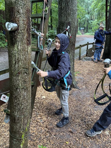 Nach einer kurzen Spielerunde zur Eingewöhnung erhielt jeder seinen Klettergurt und wurde sicher verzurrt. Dann ging es auch schon an die Sicherheitsunterweisung, bevor kein Halten mehr war und die Kinder wie junge Äffchen von Baum zu Baum kletterten. Dem Regen trotzend hatten die Kinder sichtlich Spaß hoch in der Luft und so war auch der eine oder andere Freudenschrei zu hören, als man an der Seilbahn hinab zu Boden glitt.