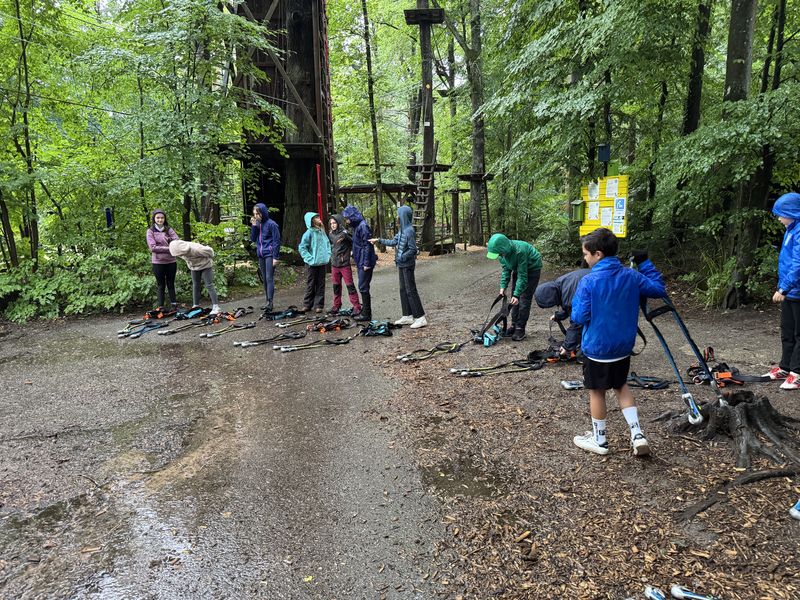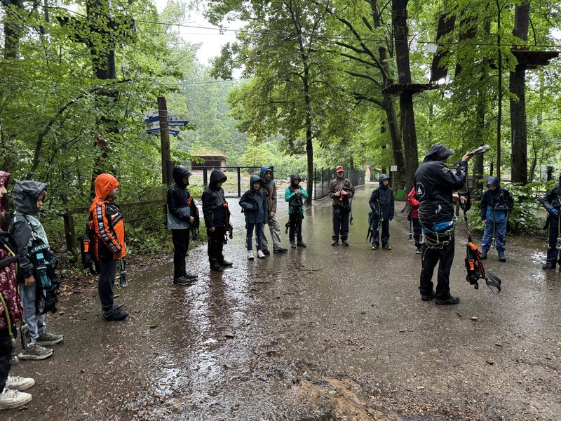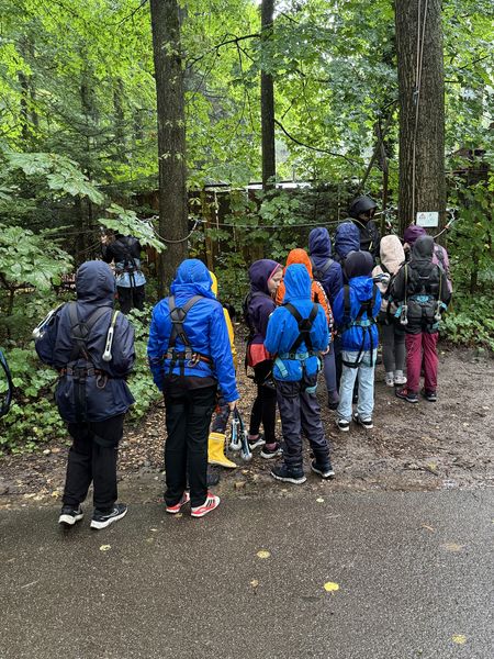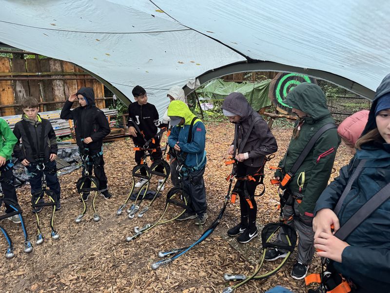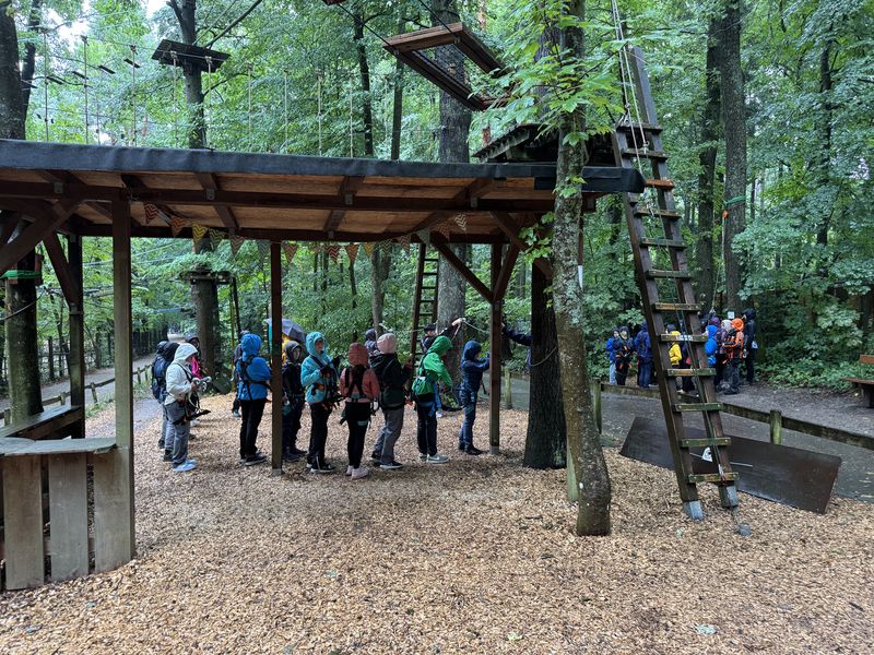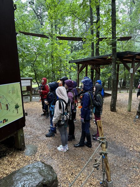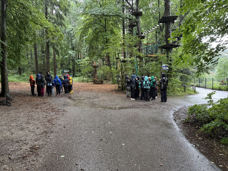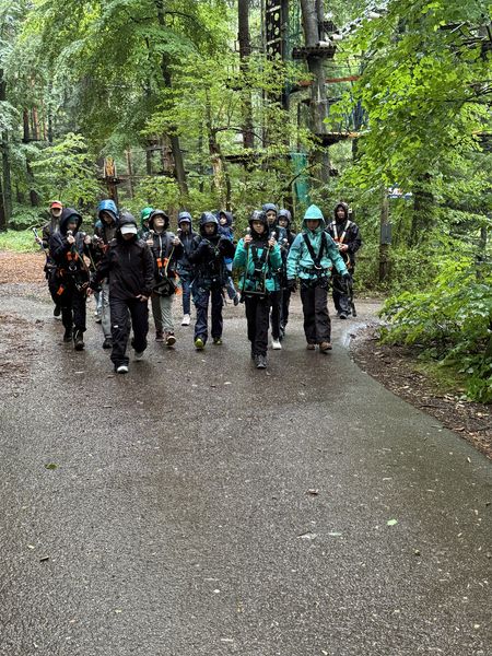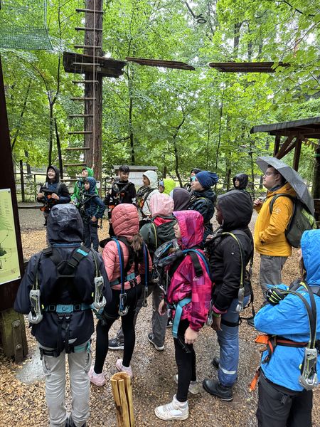Zum einen trotzten 47 Fünftklässler dem Wetter und begaben sich mit ihren Klassenlehrern Frau Kirschler, Frau Rupp, Frau Schmierer und Herrn Weigand gut ausgerüstet in den Kletterpark des Wildparks Pforzheim: Regenjacke, Regenhose, Mütze, feste Schuhe und Wechselkleidung waren die perfekten Begleiter an diesem Vormittag.