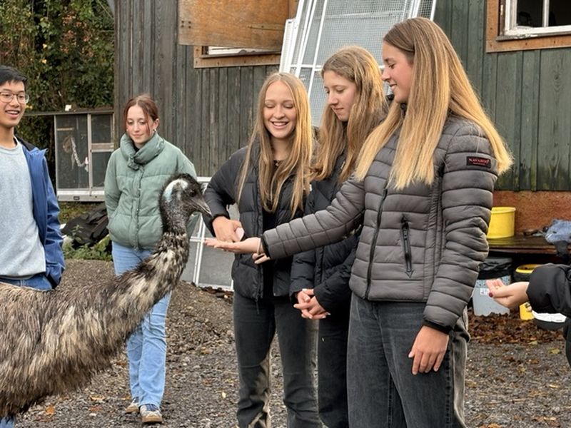 Um einen Eindruck von dem Arbeitsalltag zu bekommen, besuchten wir diese Organisation am 10.11.2025 in Huchenfeld. Die Wildtierhilfe wurde vor 10 Jahren von Jeanine Nikolaus und ihrem Mann gegründet. Diese wird zentral nur von wenigen Freunden der Familie Nikolaus in Bereichen wie Verpflegung, Auswilderung und dem Bau von neuen Gebäuden unterstützt. Jährlich durchlaufen ca. 400 bis 500 Tiere die Wildtierhilfe. Aufgrund dessen kaufte Jeanine dieses Jahr ein Grundstück, auf dem weitere Volieren und Gehege gebaut werden. Nachdem die Tiere wieder gesund sind, werden sie ausgewildert, dennoch gibt es auch Tierarten, wie zum Beispiel den Waschbären oder das Wildschwein, die nicht ausgewildert werden dürfen. Nach der 6. Stunde machten wir uns auf den Weg nach Huchenfeld, und dort wurden wir von Jeanine empfangen. Zurzeit beherbergt sie einen Emu, den sie nur vorübergehend pflegt. Anders als erwartet, war dieser sehr zutraulich, sodass wir ihn sogar aus der Hand füttern konnten. Danach durften wir sogar in das Waschbärgehege und fütterten, streichelten und bespaßten die fünf. Währenddessen konnten wir alle unsere Fragen stellen. Anschließend zeigte sie uns die Rehe. Auf dem Grundstück beherbergt sie nur einen Teil der aufgenommenen Tiere, denn zu Hause und in verschiedenen Pflegestellen sind ebenfalls Tiere untergebracht, wie zum Beispiel Igel oder Siebenschläfer. Neben der Tierpflege beschäftigt sich Jeanine mit der Umsetzung weiterer Pläne. Zukünftig sollen noch weitere Gehege und Volieren hinzukommen. Der Bau verläuft jedoch nur schleppend, da alles auf Spendenbasis geschieht. Gelegentlich finanziert Jeanine auch Dinge aus eigener Hand, wenn es einmal knapp mit den Spenden wird.