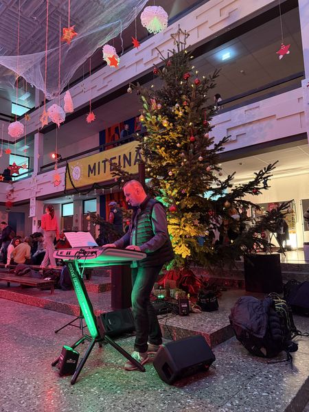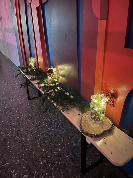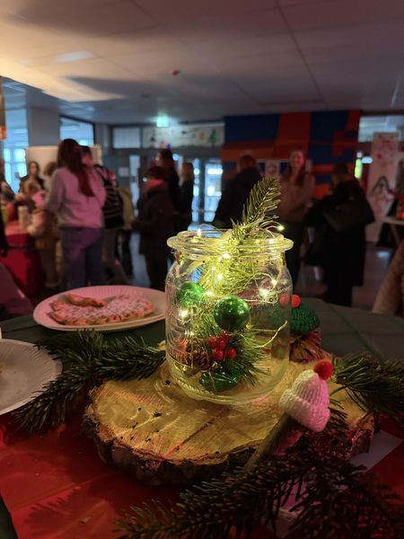Schon beim Betreten der Schule wurde man von dem Duft frisch gebackener Waffeln, Weihnachtsplätzchen und von dampfender Hot Chocolate empfangen. Ein auf Paletten arrangierter Weihnachtsbaum, ein fröhlicher Schneemann, der dank Lichterketten warm aufleuchtete, sowie schwebende Kerzen und Tannengirlanden verwandelten die Flure in eine magische Kulisse. Die Livemusik von Herrn Riechert rundete die vorweihnachtliche Stimmung ab.