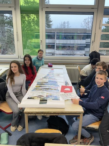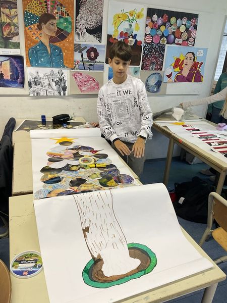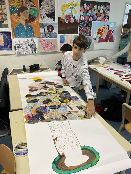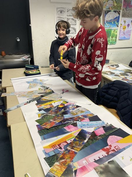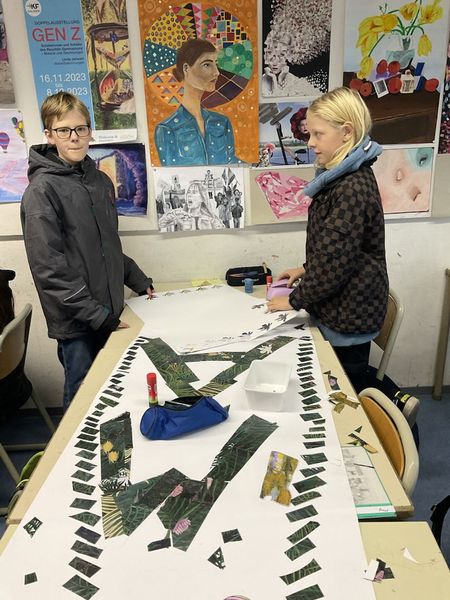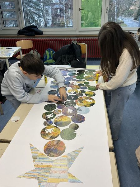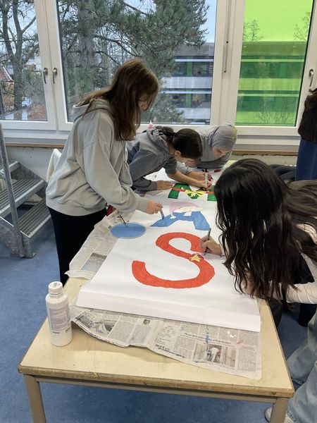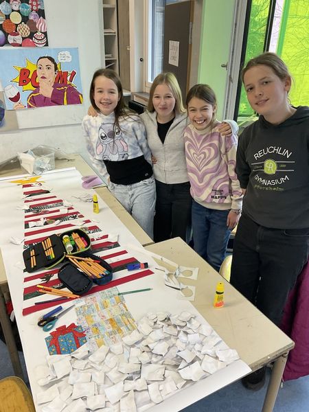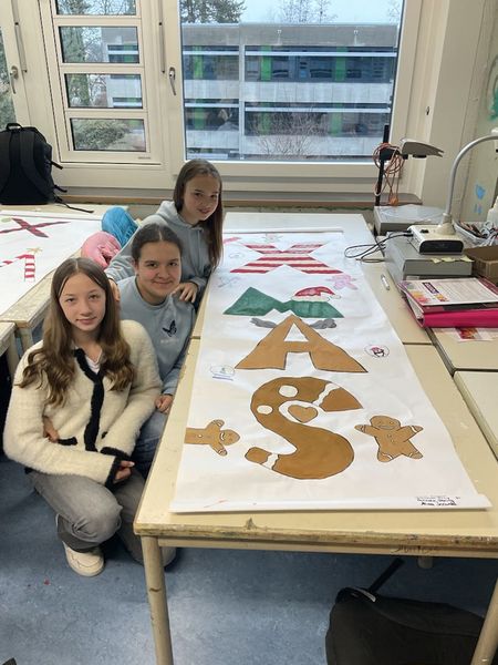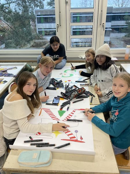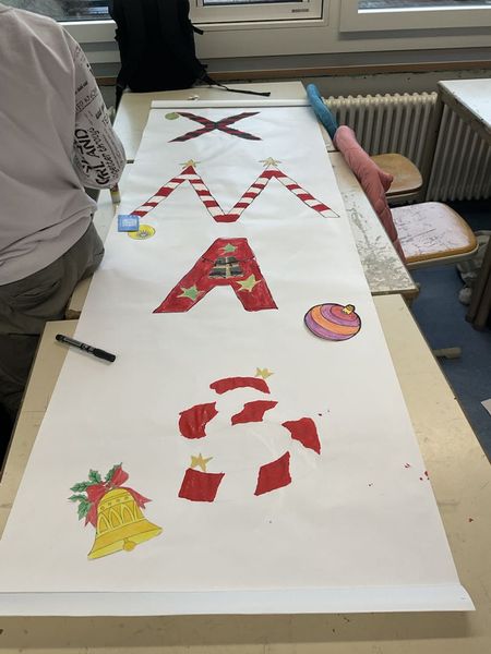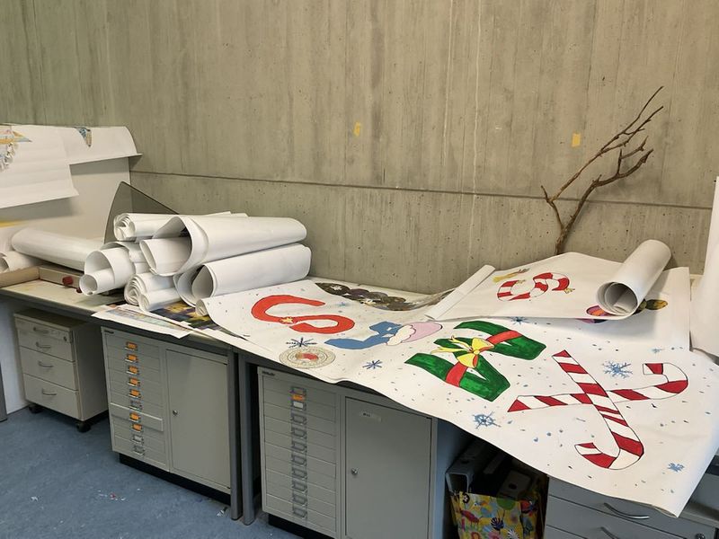 Fleißige Helfer aus verschiedenen Klassenstufen gestalten Plakate, um das Reuchlin in vorweihnachtliche Stimmung zu versetzen.